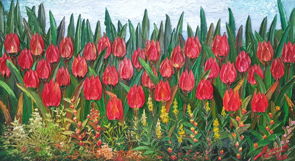 Memulai debut resmi di kancah seni Indonesia dengan lukisan dekoratif ikan Koi di mana ikan-ikan warna-warni berbaur satu sama lain di dalam air.