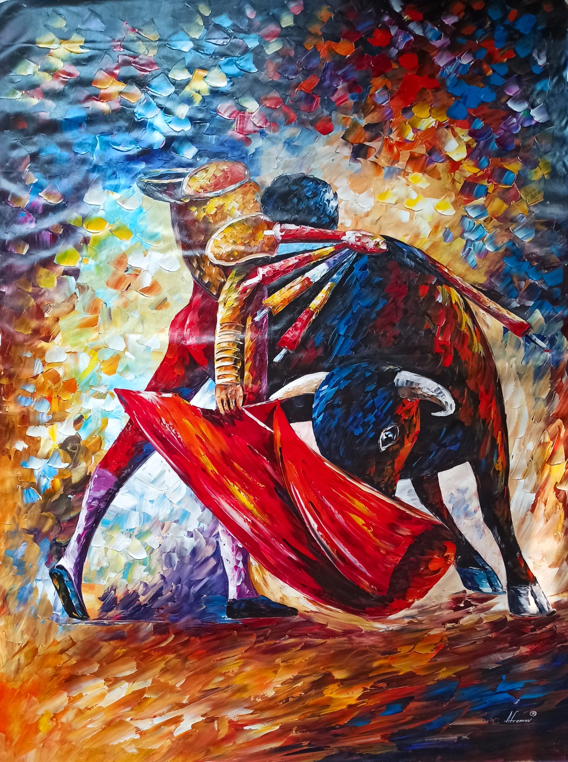Sebuah pertunjukan tradisi dari negara spanyol yang bernama matador, dimana pertunjukan ini memperlihatkan seolah manusia tengah bertarung dengan seekor banteng, da;am lukisan karya sang pelukis Leonid Afremov ini terlihat seekor banteng yang dalam keadaan penuh luka tusukan tombak pada punggungnya mencoba menyerang sang Torero dengan puncak rasa amarah dari sang banteng yang dikenal dengan jiwa penuh harga diri dalam melawan musuhnya.