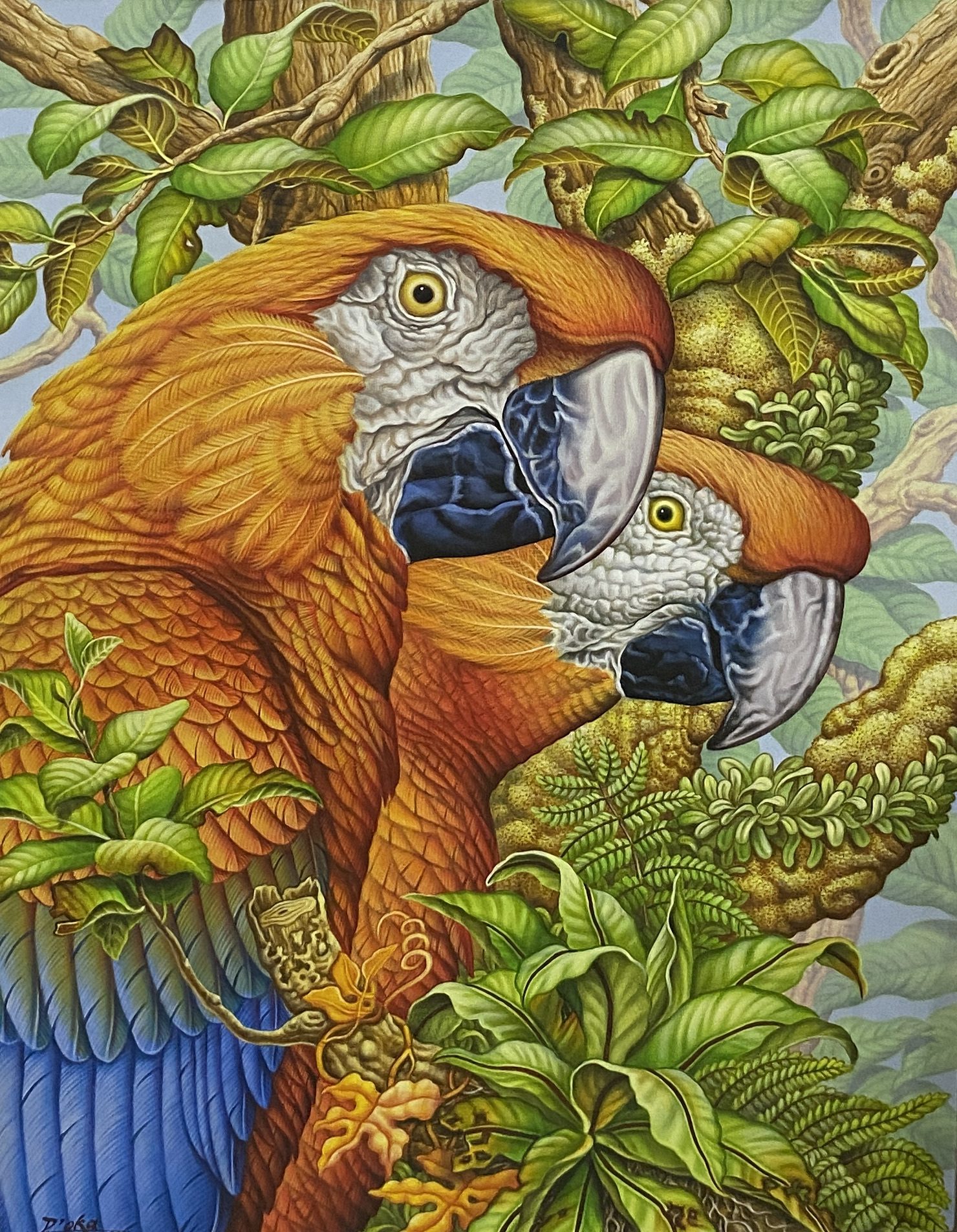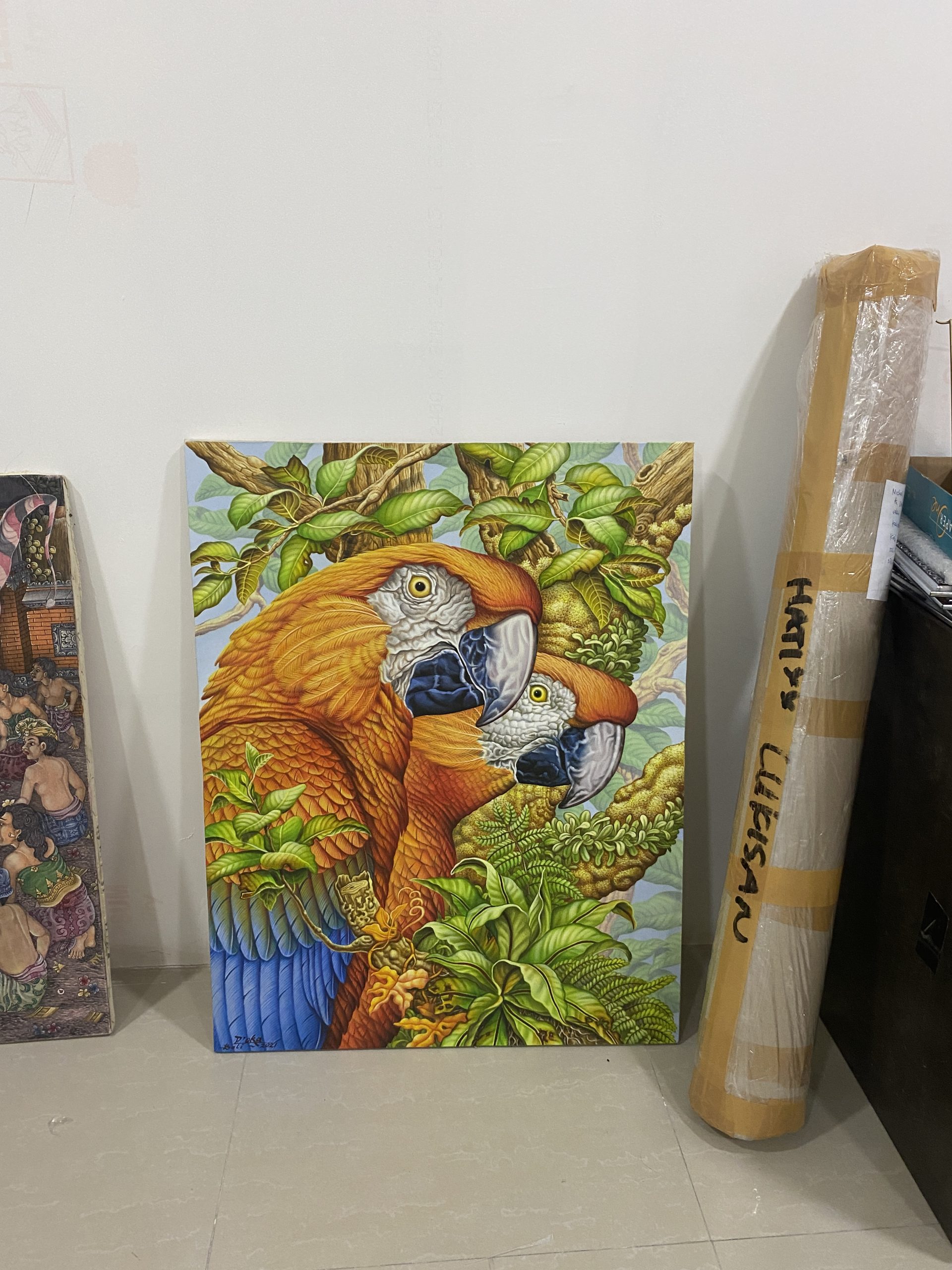 Burung Macaw memiliki banyak variasi warna bulu yang cantik dan eksotis. Meski satu keluarga dengan burung Beo namun burung Macaw memiliki ukuran yang lebih besar dan dikenal cerdas serta termasuk peliharaan yang setia, bahkan burung Macaw memiliki rentang usia yang panjang hingga lebih dari 50 tahun. Uniknya burung Macaw merupakan burung yang gemar bersosialisasi dan tidak suka suasana hening. Lukisan Macaw ini diharapkan membawa seluruh karakter positif dari si burung Macaw kepada seluruh mata yang memandang lukisan tersebut.