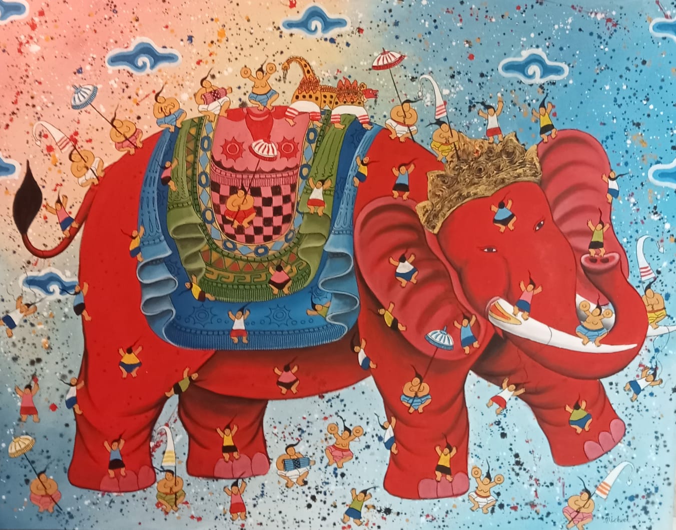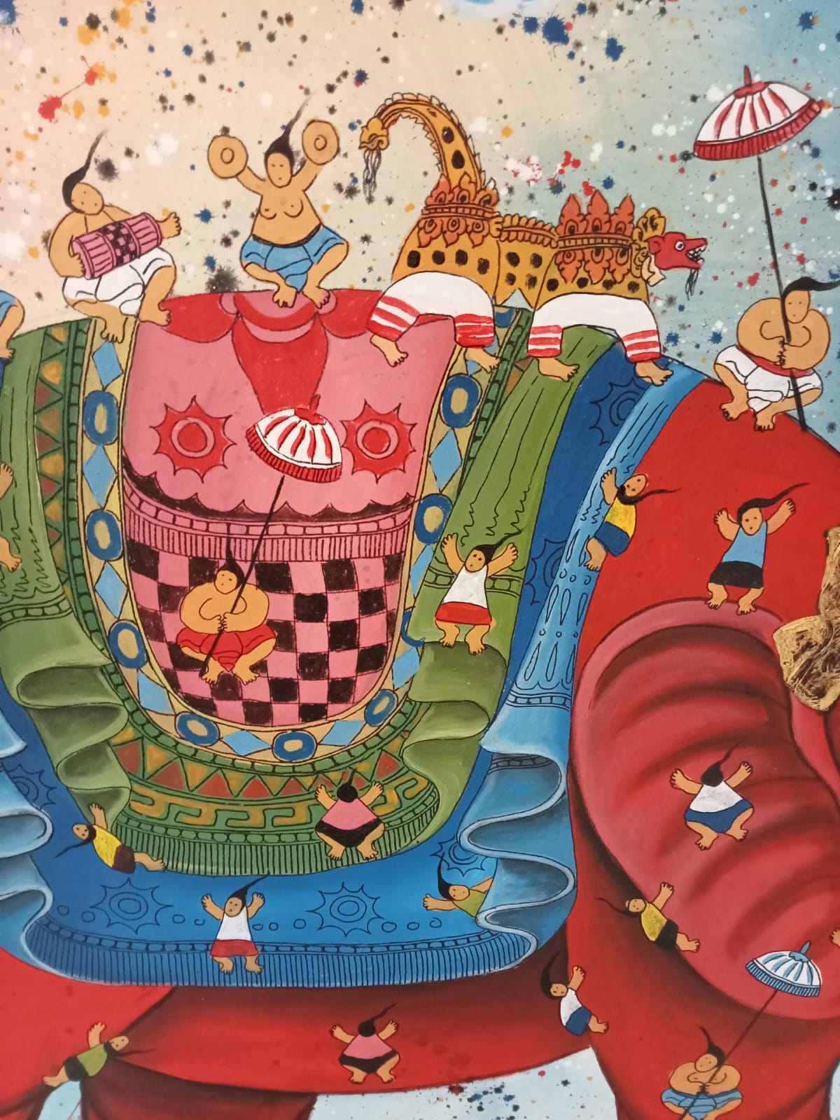 Seekor gajah yang di beri aksesoris hiasan seperti mahkota dan di arak dengan meriah dan penuh suka cita, arakan gajah ini kerap dilakukan oleh para masyarakat yang memuja gajah sebagai perwujudan Dewa dalam kepercayaan Hindu.