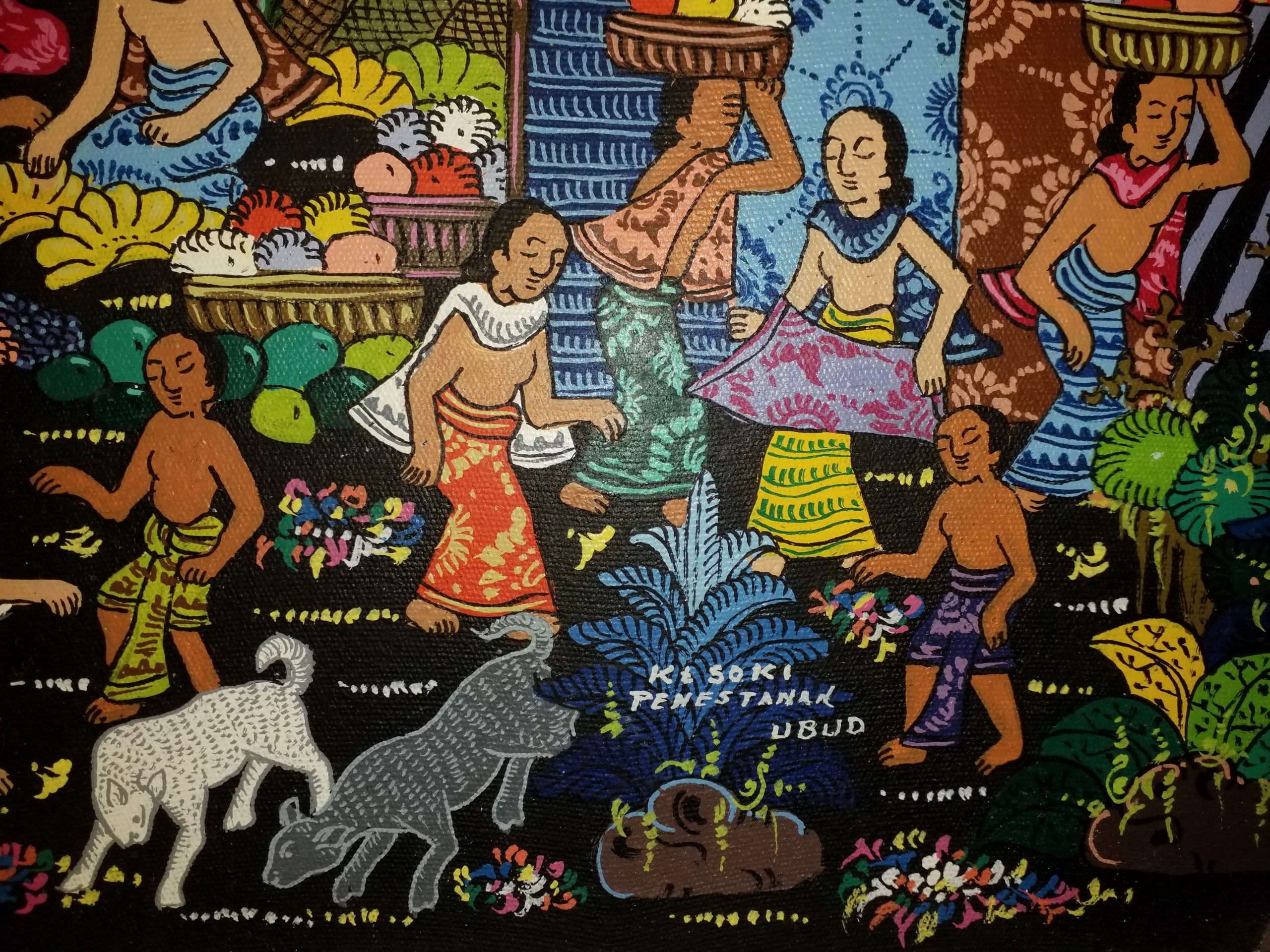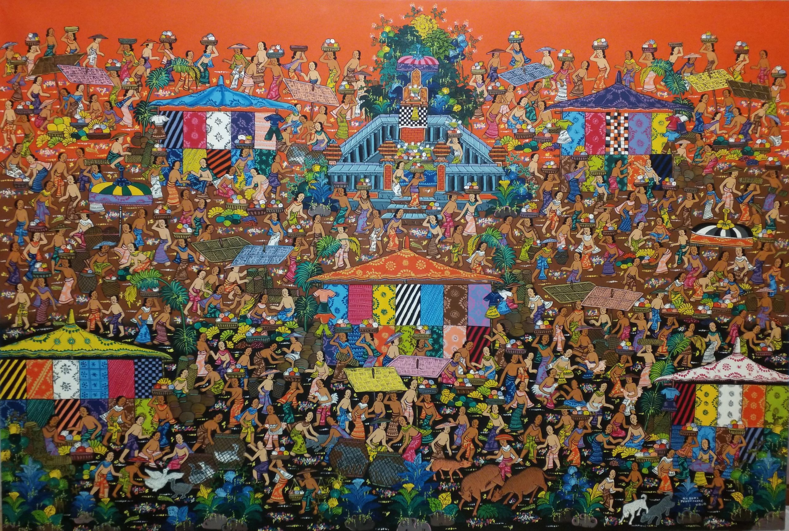 Lukisan karya I Ketut Soki yang menggambarkan sebuah pura ditengah pasar tradisional yang penuh sesak oleh masyarakat maupun hewan ternak, orang-orang dipasar menggunakan pakaian sederhana, kebanyakan diantaranya tidak menggunakan atasan, dan para wanita membawa barangnya tepat di atas kepala.