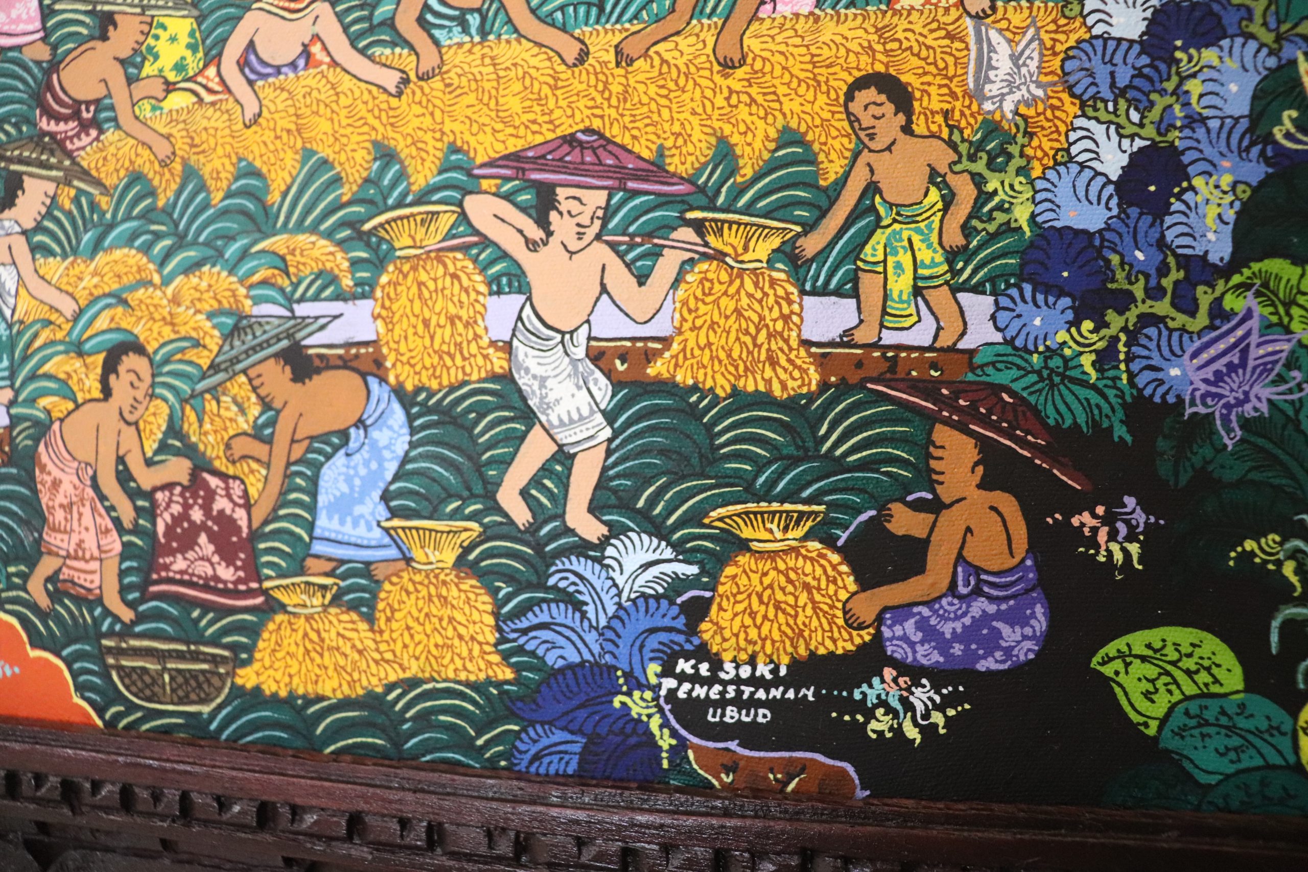 Potong Padi sebagaimana judul dari lukisan ini merupakan sebuah ritual yang digelar saat panen padi. Tujuanya adalah mengucapkan rasa terima kasih kepada Tuhan atas anugrah panen yang melimpah juga permohonan keselamatan kepada Dewi Sri agar pertanian dapat berjalan dengan baik. Dalam filosofi masyarakat Hindu Bali hal ini merupakan penerapan konsep Tri Hita Karana.