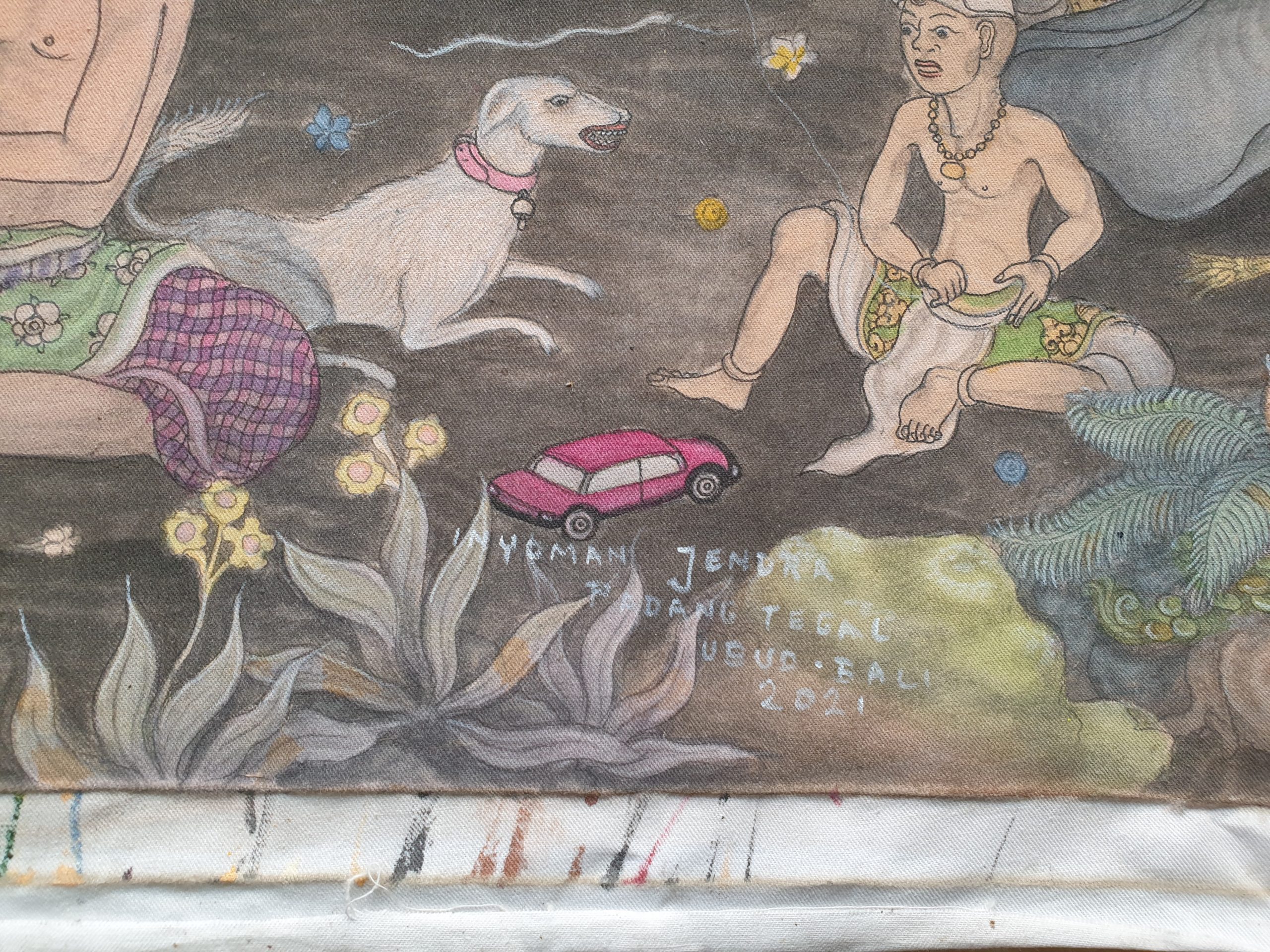 Lukisan karya I Nyoman Jendra bernama Upacara Di Pura ini menyadarkan kita bahwa adat, tradisi dan hidup adalah dekat dengan manusia, dekat dengan hiruk pikuk dan tidak berpaku hanya pada kekhusyukan. Beragam aktifitas terekam dalam lukisan ini, iring-iringan barong, adu ayam, tarian daerah, romansa pria wanita, alunan musik serta hubungan manusia dan binatang adalah sedikit contoh aspek yang membuat lukisan ini terkesan begitu ramai dan dekat dengan jiwa.