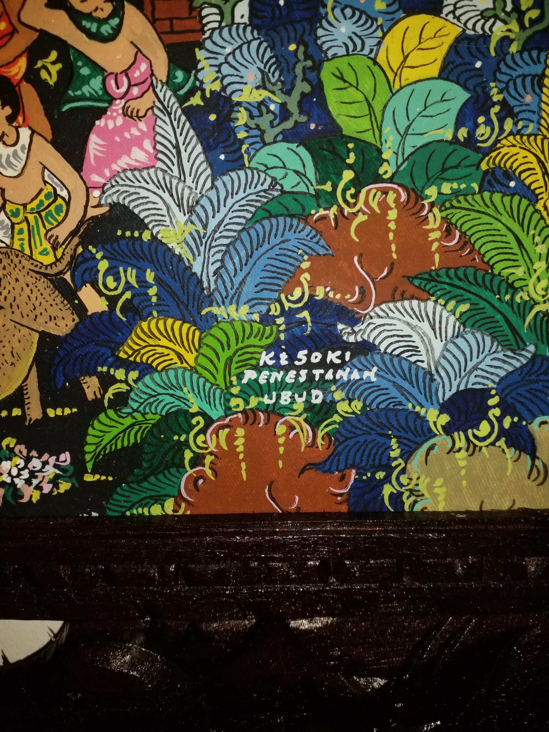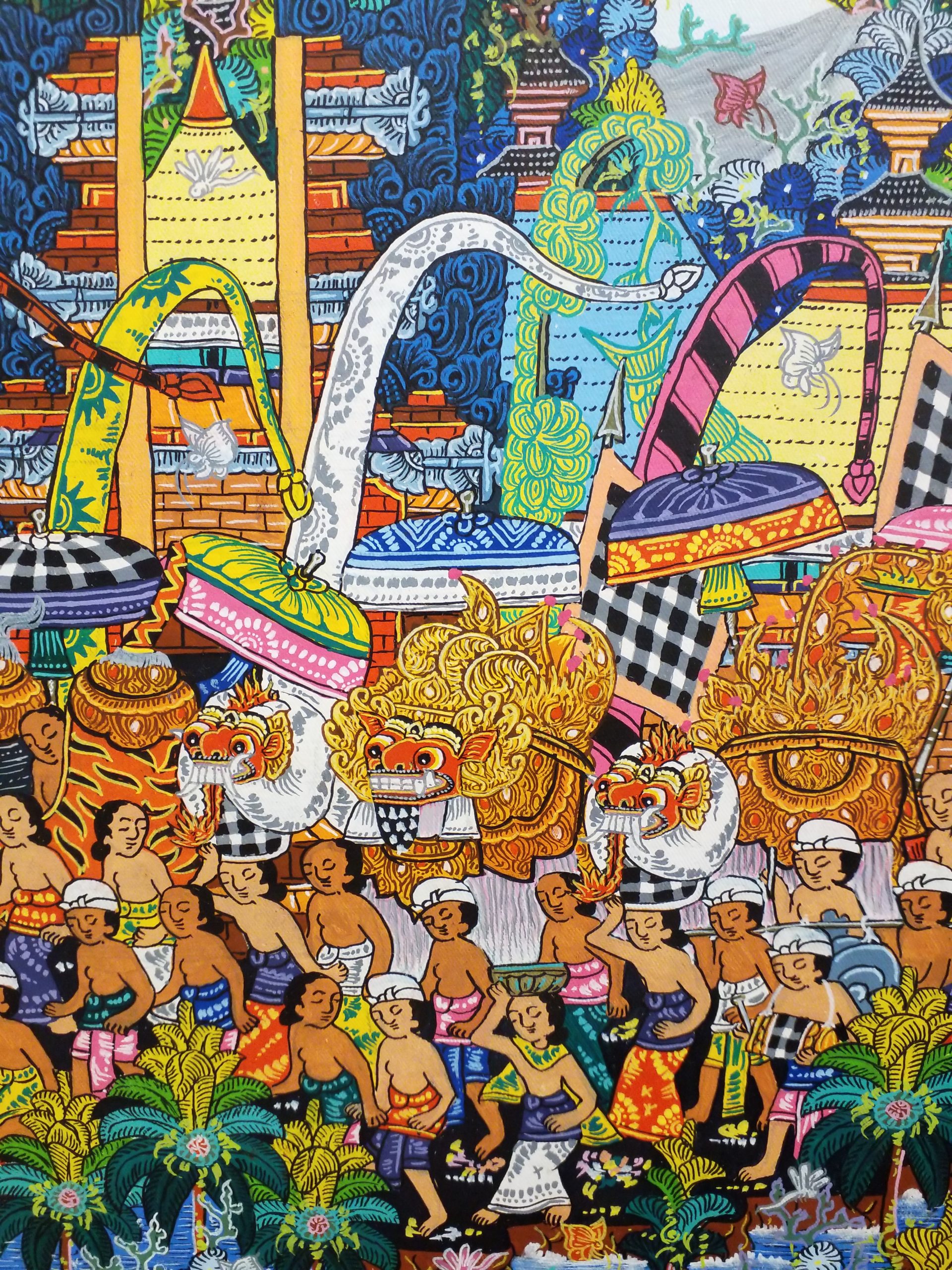 Nuansa sakral, dalam serangkaian tindakan yang tertata sesuai perencanaan dalam aturan tradisi yang penuh akan nilai-nilai sosial secara turun temurun, lukisan I Ketut Soki yang menggambarkan suasana upacara yang penuh semarak dari orang-orang dewasa maupun anak-anak, umbul-umbul yang menjulang tinggi mengikuti pepohonan sekitar dengan arakan parade dari masyarakat yang terasa kontras dipandang.